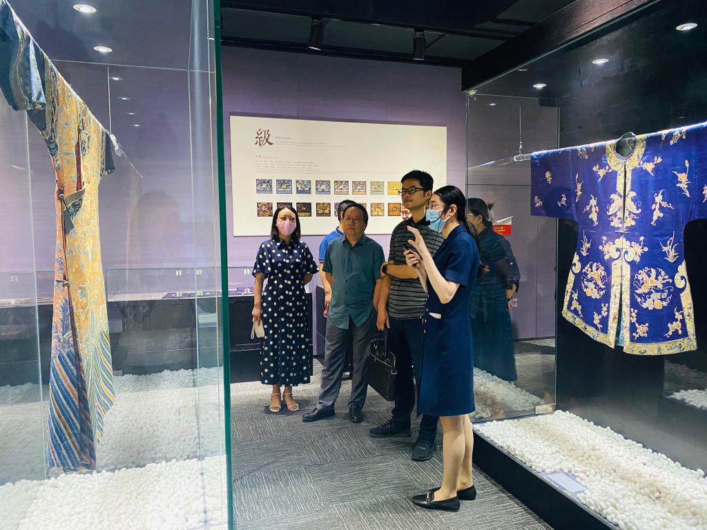 学院一行先后参观了万事利丝绸文化博物馆和丝绸汇展厅,观看了4D交互媒体演绎秀,感悟刺绣、缂丝等非遗丝织技艺的背后,万事利在挖掘、保护、传承和弘扬丝绸文化上的专注与坚韧。
