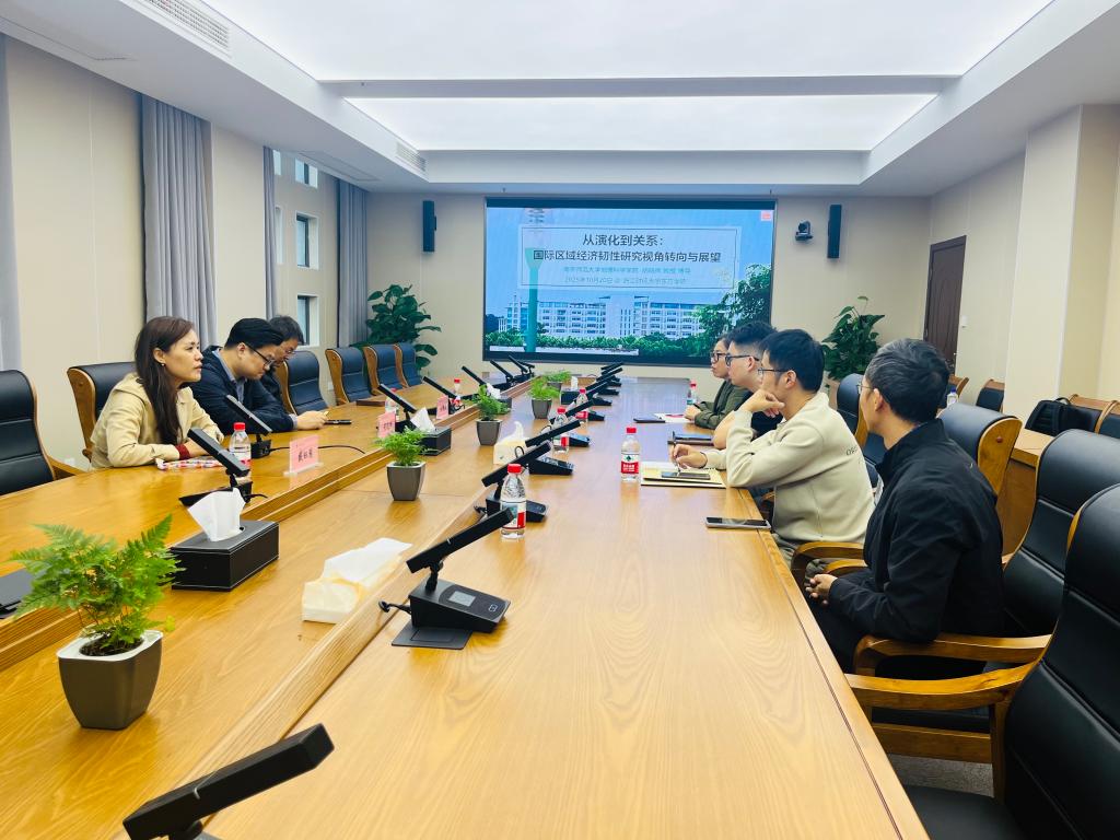 讲座中,胡晓辉教授从韧性概念的跨学科演化切入,梳理其自物理学发端,延伸至生态学、心理学,最终融入区域经济领域的脉络。结合全球逆全球化、再区域化趋势与我国双循环战略,他指出,政策层面对产业链安全、供应链韧性的重视,正推动区域经济研究迈向新维度。他对比传统区域经济研究与全球化视角下中国模式的差异,拆解经济韧性的脆弱性、抵抗力等核心维度,强调研究重心已从“恢复力”转向长期“适应力与转型力”。针对冲击的多元性,他提出研究视角需从“演化经济学”转向“关系视角”——前者可量化产业抗冲击能力,后者聚焦区域在经济链条中的地位,并以东莞代工产业、台湾芯片产业及浙苏疫情恢复差异为例,让两种视角的实践价值更具象。