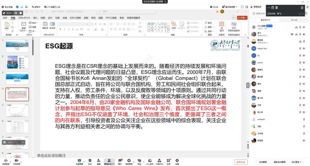 韩飞老师围绕ESG信息披露及高管过度自信对企业ESG考量的影响进行了全面而深入的探讨。从ESG的起源、企业社会责任的发展历程出发,逐步深入到ESG信息披露的研究现状、趋势及其对公司财务绩效、公司治理等多方面的复杂影响。尤其对高管过度自信与企业社会责任的关系进行了细致剖析,通过多角度多层面的分析,揭示了高管过度自信可能导致的企业过度投资、过度研发及环境信息披露质量下降等问题,为参会者提供了全新的视角和思考。同时,韩飞老师还探讨了ESG投资与股票收益率之间的关系,进一步丰富了讲座的内容。