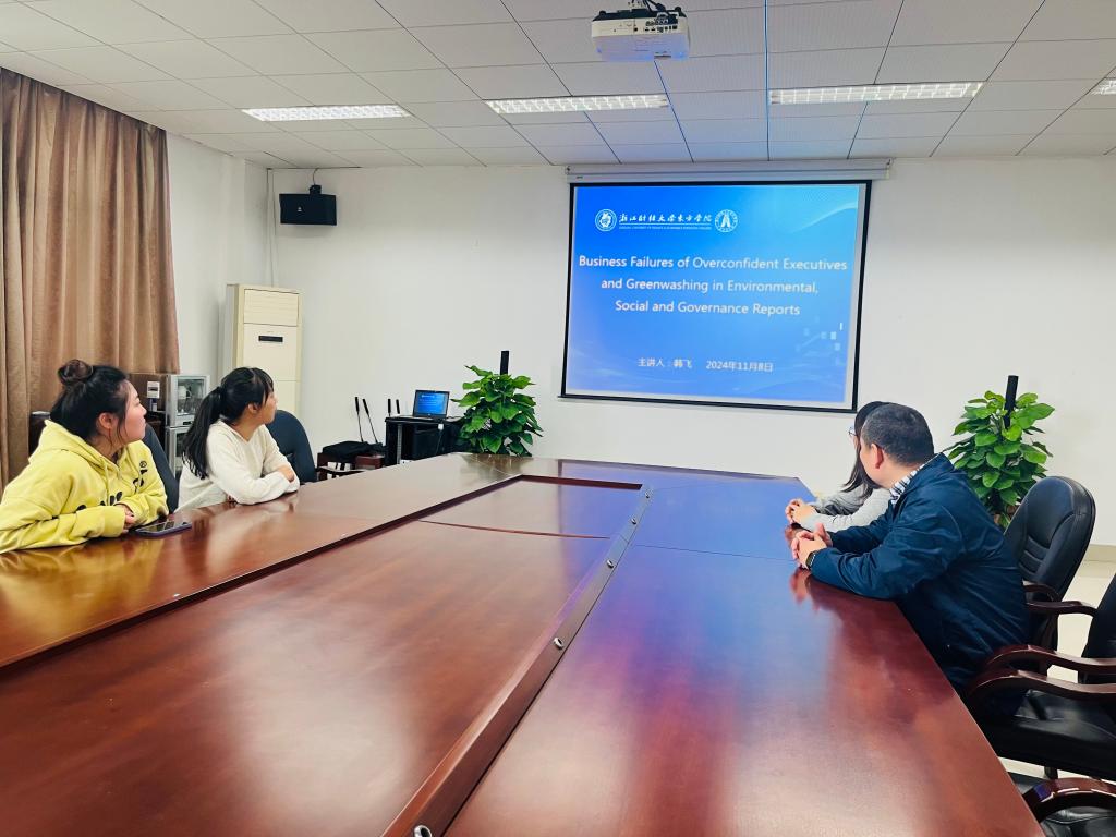 11月8日,学院邀请内蒙古工业大学硕士生导师韩飞,作《Business Failures of Overconfident Executives andGreenwashingin Environmental, Social and Governance Reports》线上专题学术讲座。讲座由伟德国际VICTOR1946副院长戴钰慧主持,学院的骨干教师、青年教师参会。
