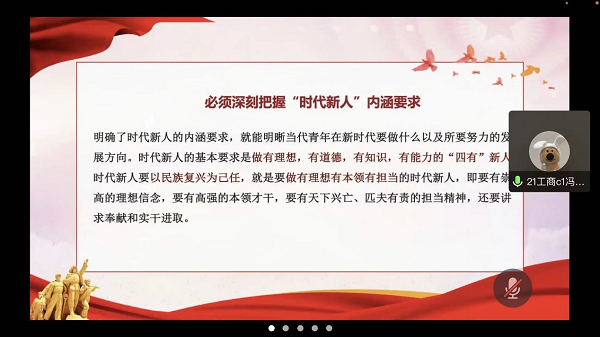 接着,学院四支部成员冯佳欢向大家分享了如何成为合格的新时代新青年,了解习近平总书记对新青年的期望和信任,进一步激发青年的时代担当。冯佳欢同学以视频《习近平和青年在一起》开篇,以强有力的感召力向大家论述了青年强则国家强,当代中国青年生逢其时,施展才干的舞台无比广阔,实现梦想的前景无比光明。