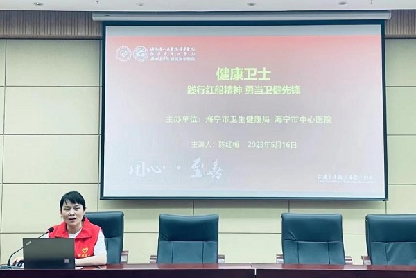 本次讲座由海宁市中心医院行政党支部书记、护理部科护士长陈红梅为同学们进行健康知识科普。首先,她强调了健康知识的必要性,并提出当代大学生心理健康教育的重要性,其次通过举例科普了一些心理知识,为同学们调整自己的心理压力提出了有效的方法和建议。陈红梅告诫大家要改变不良的生活方式,摒弃不健康的生活习惯,要善于调适自己的心理压力。最后陈红梅也针对大家提出的问题,现场进行详细指导。
