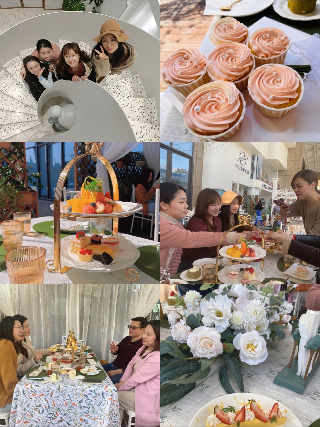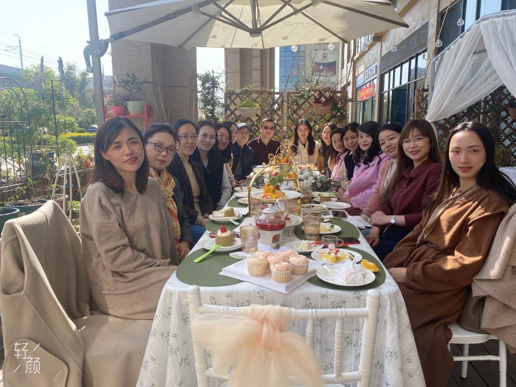 恰逢春光明媚,茶厅环境宜人:室外篱笆小院,日光熠熠,繁花爬墙,自在一方;室内布局玲珑通透,摆件展台斑斓错落,层次设计处处皆景。游赏休憩过后,大家依次入座,一份份精致的茶点如期而至。玫瑰花瓣在透明的玻璃茶壶中轻舞飞扬,蛋糕和水果塔邂逅在英式瓷盘装盛的甜品架,宽慰了众人的口腹和心灵。女教工们或欣赏美景合影留念,或回忆教学生涯趣事、畅谈未来生活设想,品茗尝鲜,畅所欲言,现场氛围和谐欢愉。