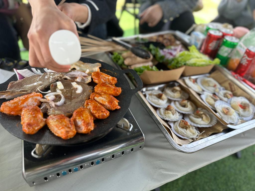 天为罗帐地为毡,山野虫鸣伴我憩。露营地地处龙山南麓,钱塘江北岸,在城市边缘,在山野之间。如今,通过当地政府的不懈努力,尤其是美丽乡村建设,才有了现在安逸舒适的网红村落。篝火跃跃燃烧,烤肉滋滋冒油。教师们自助烹食美味,肥而不腻的五花肉、鲜香四溢的鱿鱼串,大家纷纷大快朵颐,畅谈教学生涯趣事,现场氛围和谐欢愉。